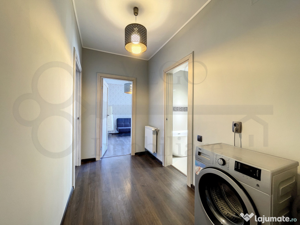 Locuința se desfășoară pe o suprafață utilă generoasă, de 93 mp, se închiriază complet finisată, mobilată și utilată modern, cu materiale și electrocasnice de calitate, iar în rândul dotărilor menționăm pardoseala cu parchet laminat, ferestre termoizolante cu tâmplărie PVC, uși interioare din lemn și ușă metalică la intrare.