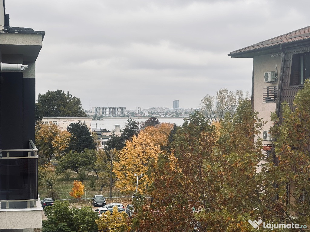 Terasa spațioasă a apartamentului are o vedere frumoasă la Lacul Morii.