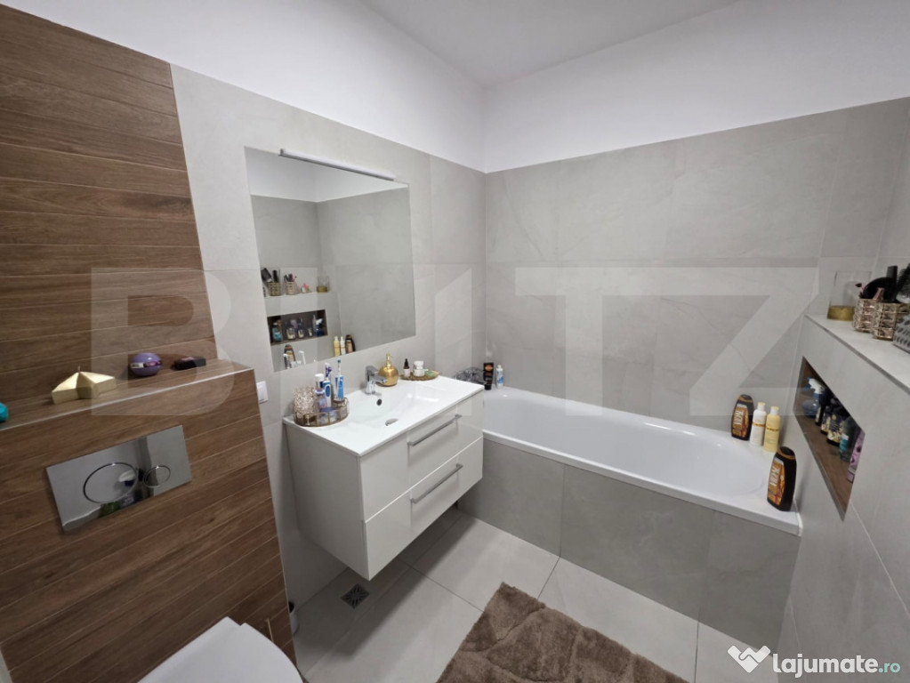 Amenajată elegant, cu finisaje ceramice mari, cadă, lavoar cu dulapuri suspendate și multiple spații de depozitare.