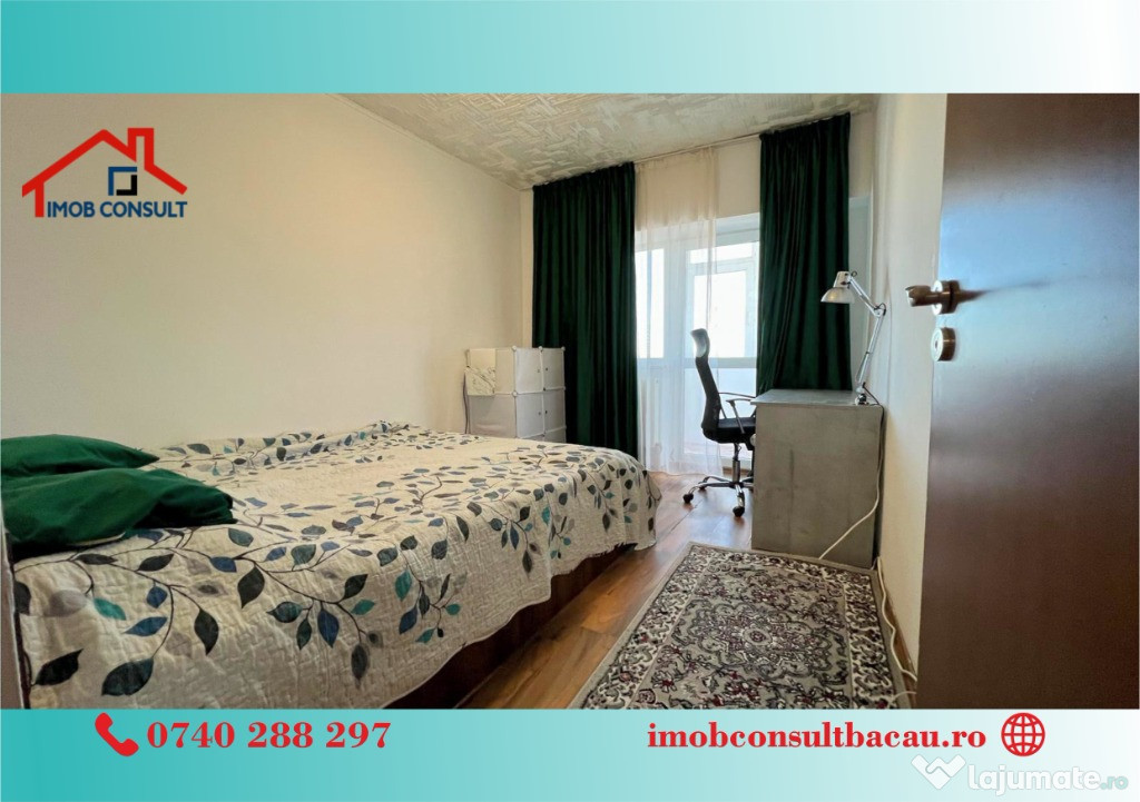 Echipa Imob Consult Bacau vă propune spre vânzare un apartament deosebit, cu 3 camere spațioase, situat într-o zonă foarte bună (proximitatea centrului commercial Cora), apreciată pentru liniște, siguranță și acces facil către toate punctele de interes ale orașului.Locuința se remarcă printr-o priveliste panoramică impresionantă asupra Insulei de Agrement si a raului Bistrita, ce poate fi admirată atât din livingul generos, cât și de pe cele două balcoane care oferă momente de relaxare la orice oră din zi.