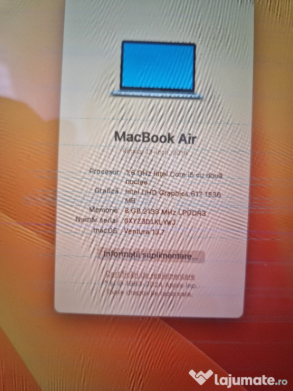 MacBook Air (13-inch, 2017) Bateria in conditii bune Complet cu incarcator Intel core i5 8GB Ram S ...