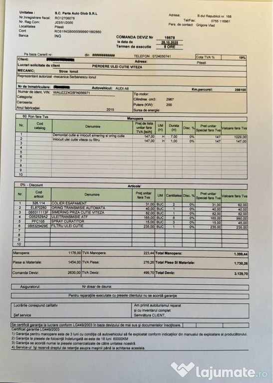 Revizie cutie in 28.10.2025 - ulei / filtre - detin factura.