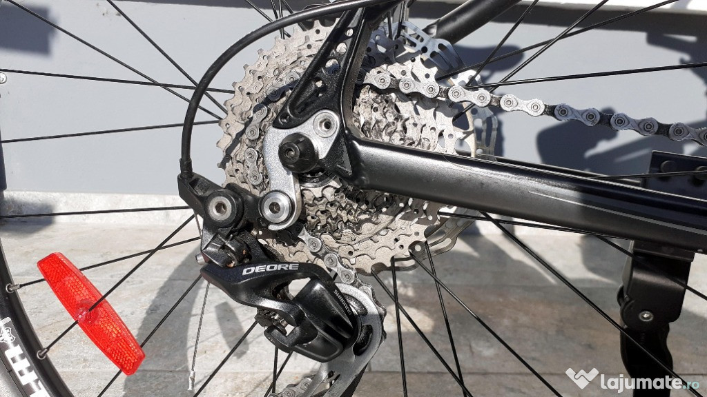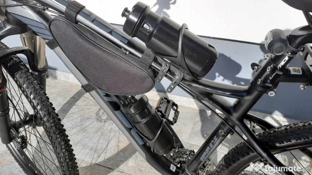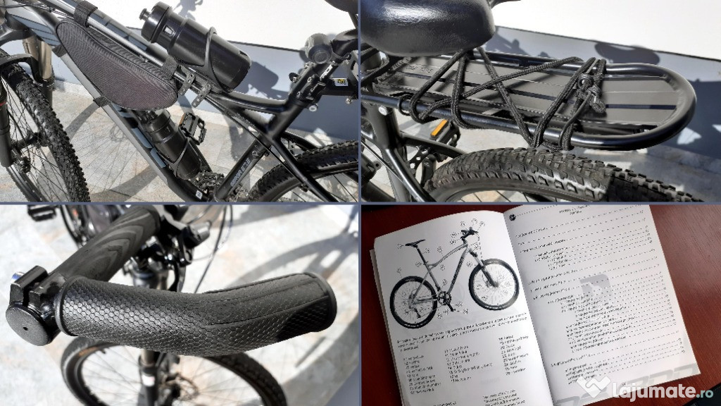 Accesorii incluse in pret, cumparate pentru completare la momentul achizitiei bicicletei: ciclocomputer, sonerie, set lumini cu LED fata/spate, portbagaj, cric, extensii ghidon, geanta cadru, suport bidon, bidon, stopuri roata, manometru, chei tip briceag, pompa aer.
