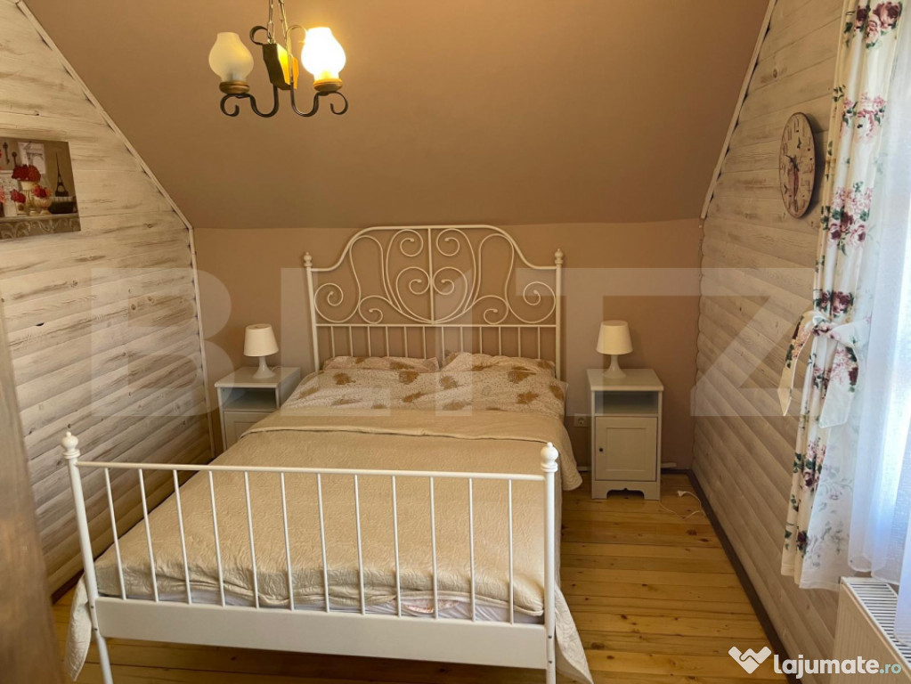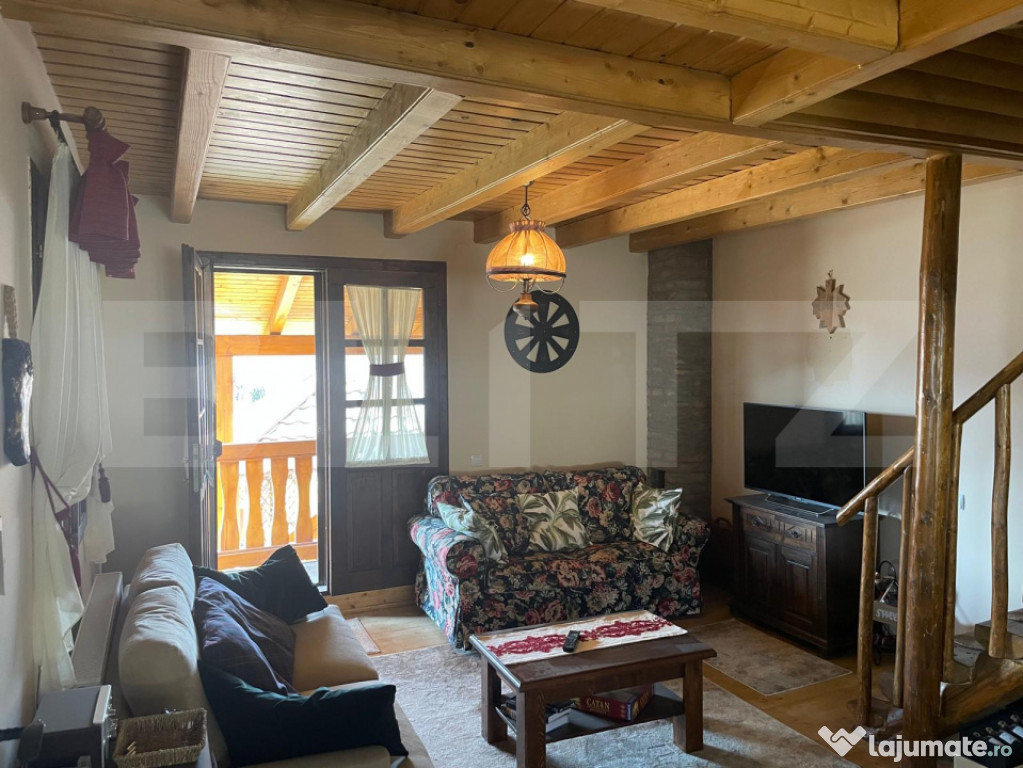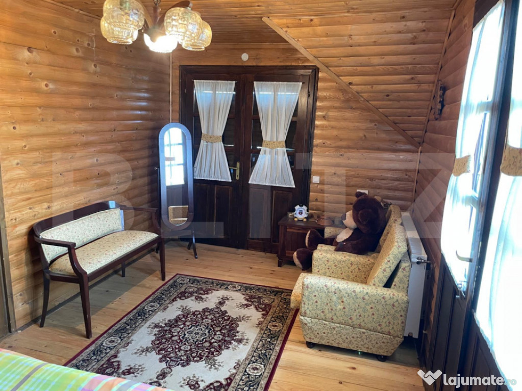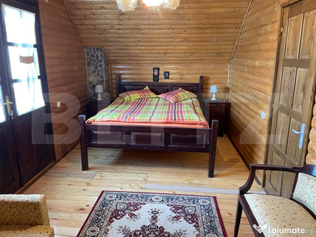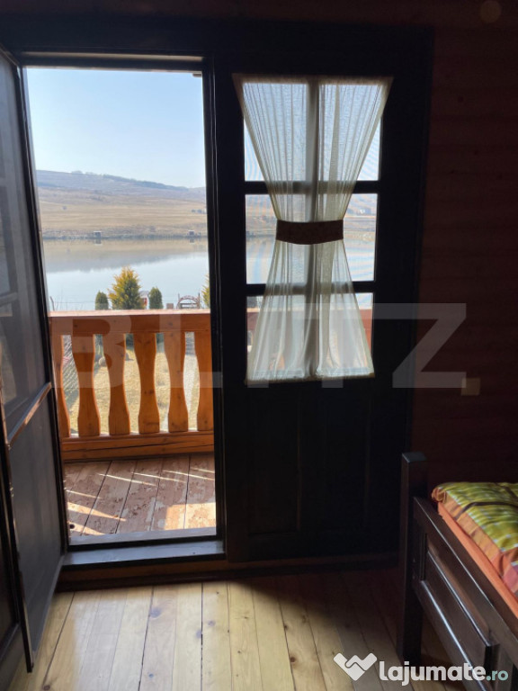 Etaj: două dormitoare primitoare, baie cu cabină de duș.Proprietate unică, situată într-o zonă liniștită, cu priveliște superbă asupra lacului.