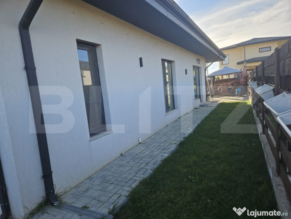 In curte gasim un garaj generos si o alee betonata. De jur imprejur gasim un gazon ingrijit si langa casa un trotuar pavat si o terasa.