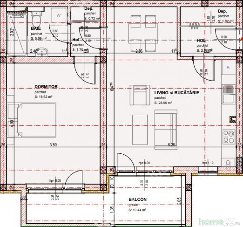 Separat de suprafata utila a apartamentului mai beneficiaza si de balcon cu suprafata 10.44 mp in care accesul se face din camera de zi si dormitor.