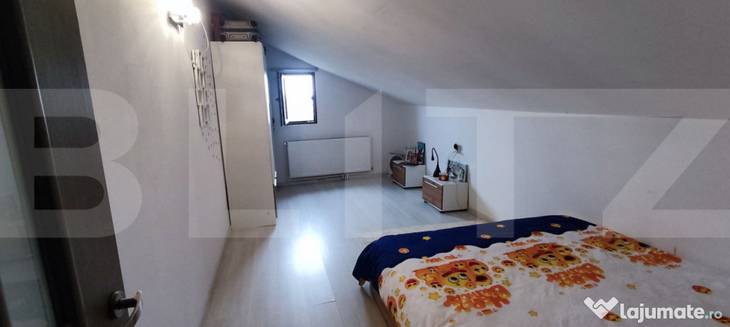 Această ofertă reprezintă o combinaţie excelentă între confort (mobilă nouă, dotări moderne, pod locuit, iluminare LED), spaţiu exterior generos (curte amenajată cu aspersoare, terasă + beci) şi acces facil la infrastructură.