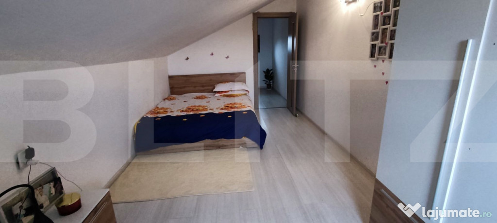 Imobilul este mobilat cu mobilă nouă și beneficiază de iluminare LED în interior. Structura casei include etaj + pod locuit, bucătărie închisă, 3 dormitoare şi 2 băi.