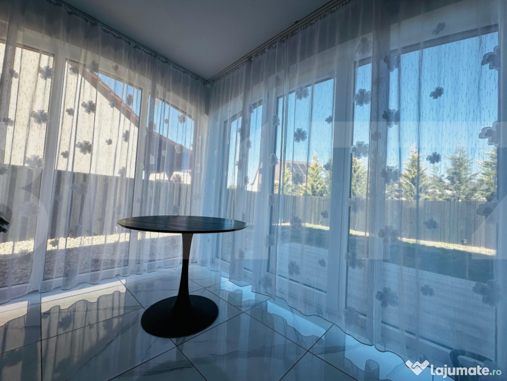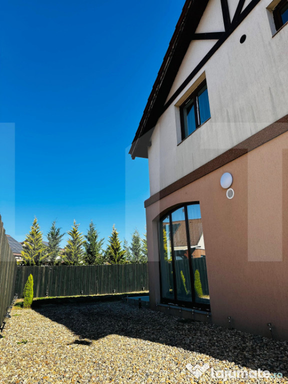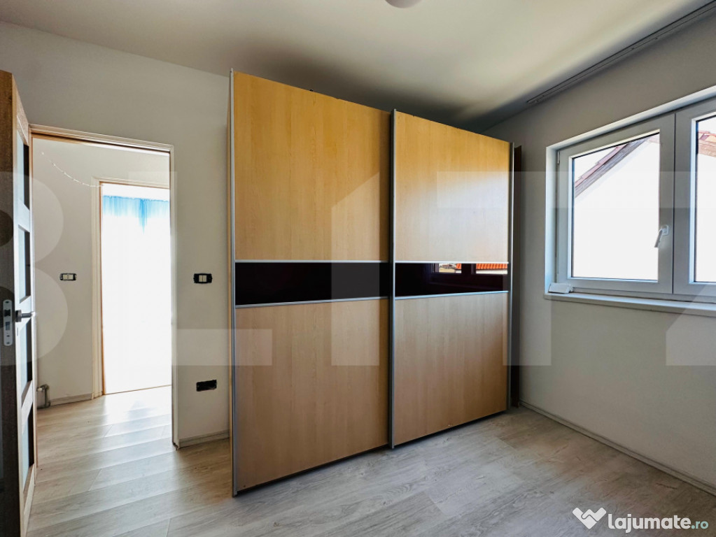 La parter se află livingul, bucătăria, un dormitor ce poate fi utilizat și ca birou, o baie, camera tehnică și cămara. La etaj sunt trei dormitoare și o baie, iar dormitorul matrimonial dispune de dressing.