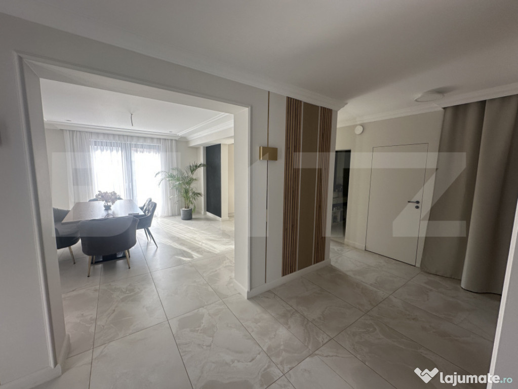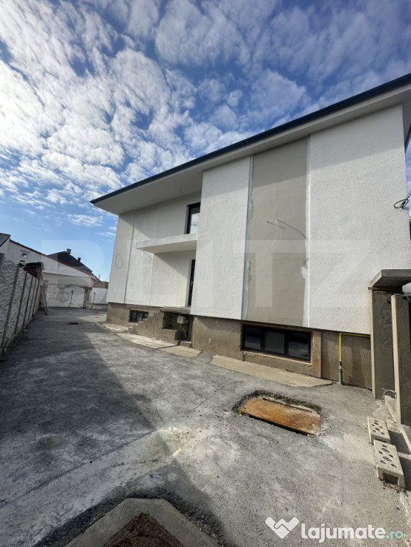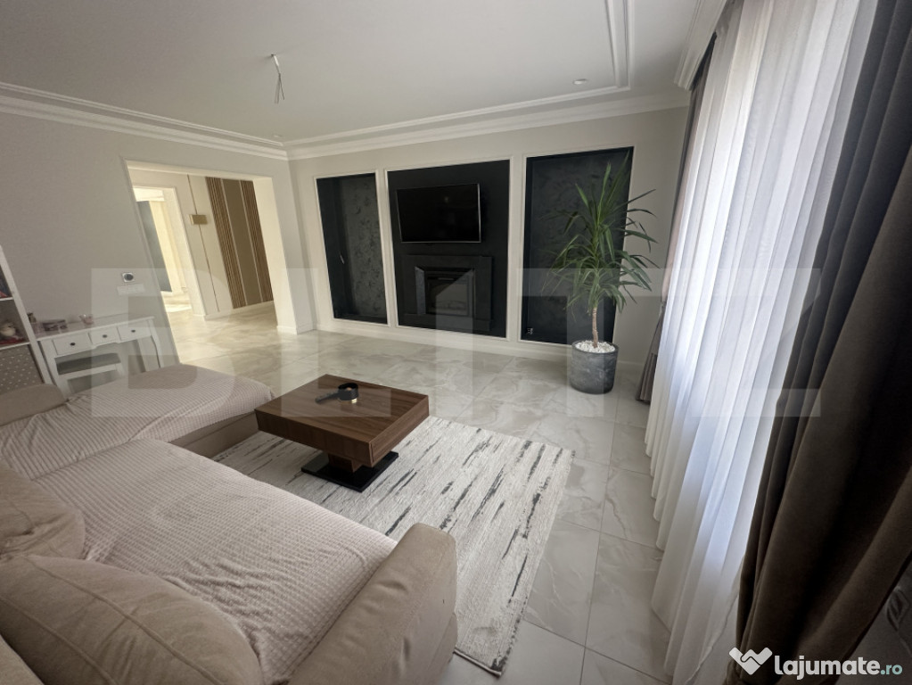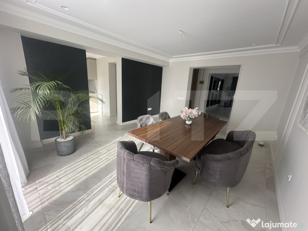 Finisajele sunt de calitate premium, iar întregul proiect a fost realizat sub îndrumarea unui designer de interior. S-au folosit materiale durabile și elegante, care oferă atât funcționalitate, cât și estetică rafinată.Curtea este spațioasă și bine amenajată, oferind posibilitatea de parcare pentru 5-6 autoturisme – un avantaj major dacă se dorește transformarea proprietății într-o clinică sau spațiu comercial cu trafic frecvent.