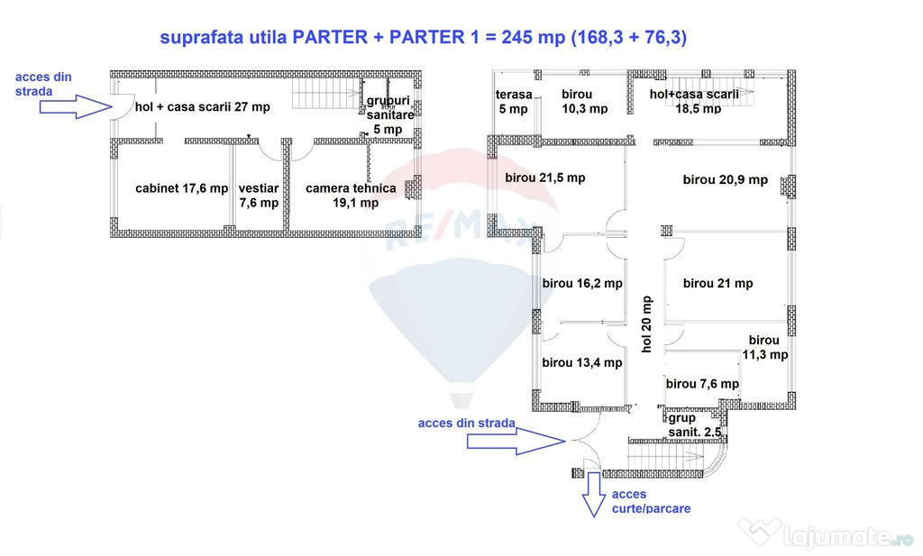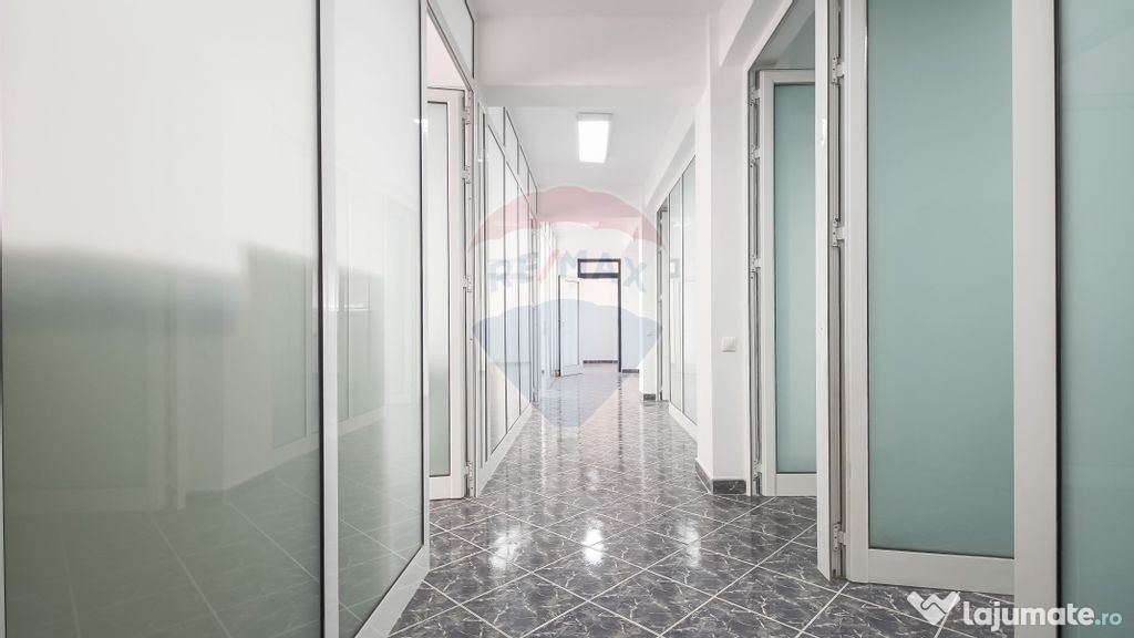 Parter și parter 1, 245 mp, cu 9 camere, 2 grupuri sanitare, hol, casa scării și vestiar. Șase camere sunt deja amenajate pentru cabinete stomatologice, cu instalații specifice pentru unituri dentare.