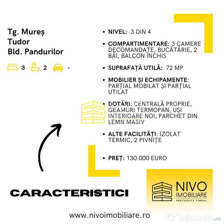 Anuntul Apartament 3 camere – Tg. Mureș – Tudor – Bld. Pan... este adaugat de pe LaJumate.ro.