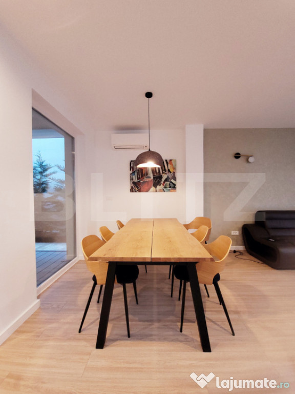 Living amplu cu zonă de dining și ieșire pe terasă