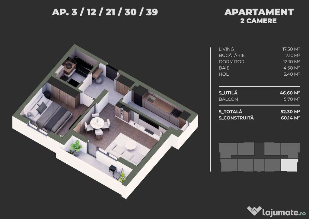 Destinat celor care stiu sa pretuiasca armonia spatiilor, calitatea solutiilor constructive, totul la un pret atractiv, iar compartimentarea moderna completeaza echilibrul si atmosfera calduroasa a interiorului.