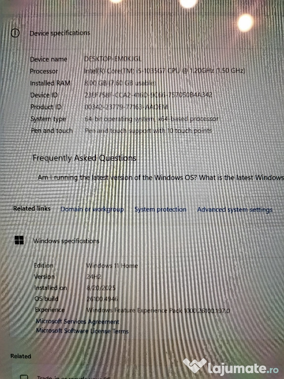 Microsoft Surface Laptop 3 2K Display touch screen 13 inch Intel (R) Core I51035G7 CPU @1.20GHz(1.50GHz) 8Gb ram Ssd 256gb Windows 11 Home 24H2 încărcător original nu dețin cutia stare bună puțin folosit