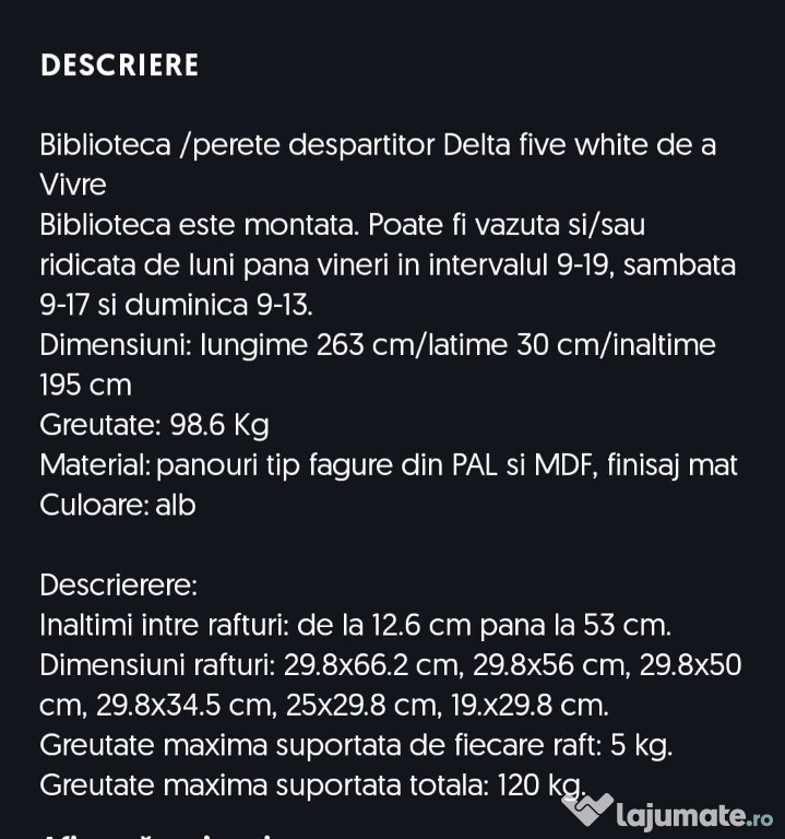 Biblioteca / perete despartitor Delta five white de la VivreBiblioteca este montata. Poate fi vazuta si/sau ridicata de Luni pana Vineri in intervalul orar 9-19, Sambata 9-17, Duminica 9-13;