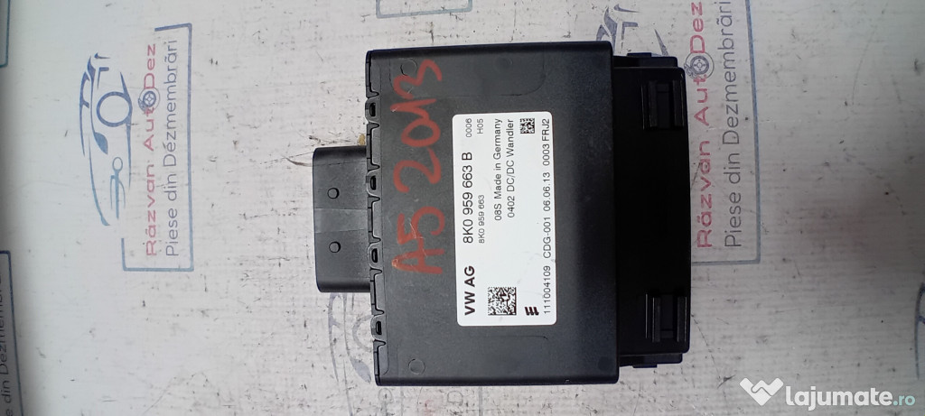 Modul stabilizator tensiune Audi A5 2013. Cod(uri): 8K0959663B. Piesele comercializate sunt originale, provenite din dezmembrari. Dispunem de o gama larga de piese multimarca. Piesele sunt verificate inainte de a fi puse spre vanzare. In caz de neconformitate piesa se poate returna. Va rugam sa verificati disponibilitatea pieselor telefonic. Trimitem in tara prin curier.Marcă: Audi