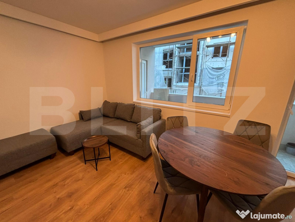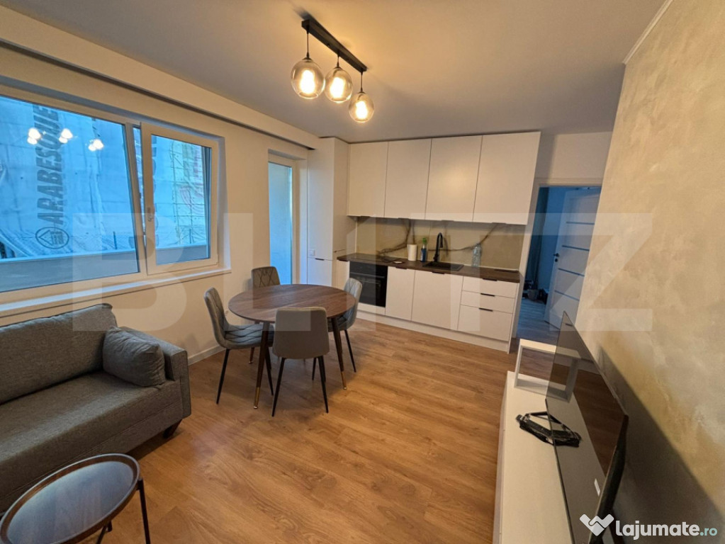 Living luminos cu bucătărie open-space, complet mobilată și utilată