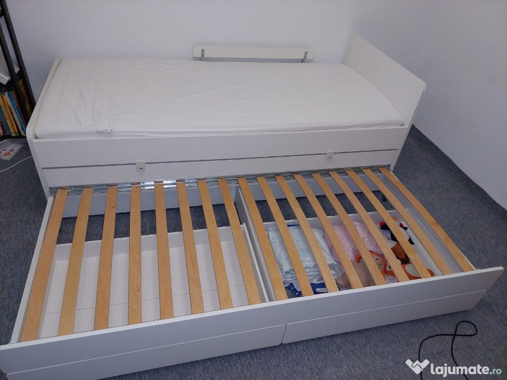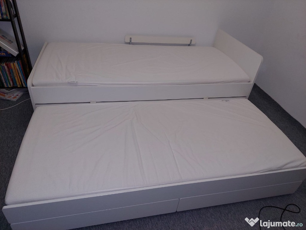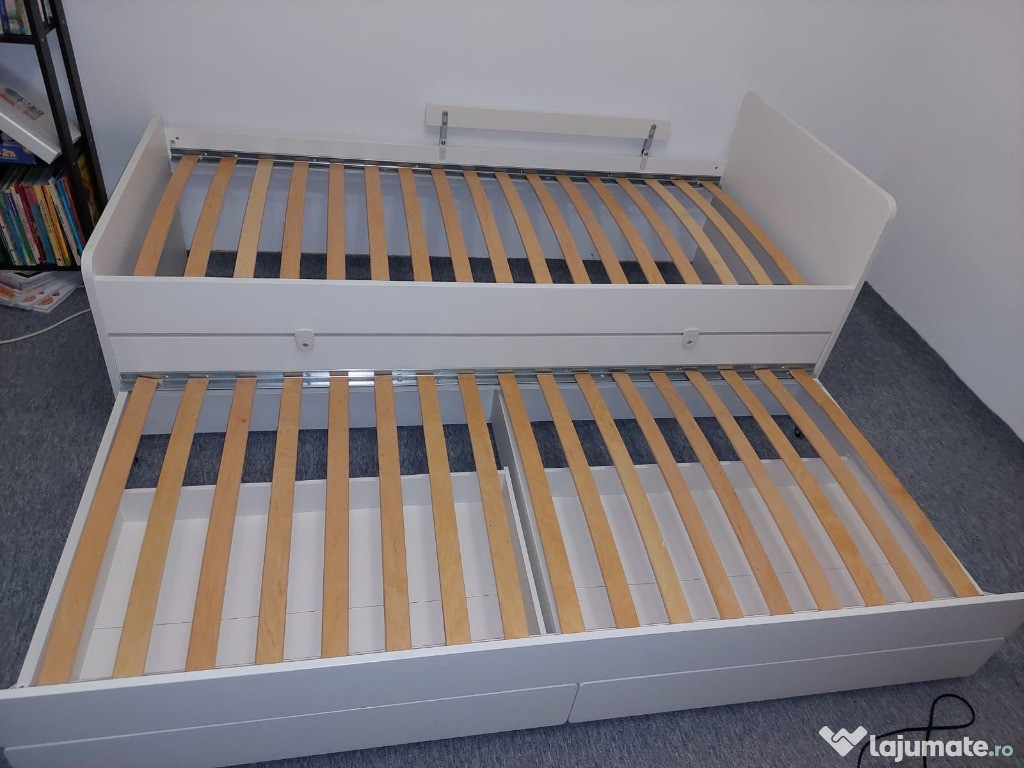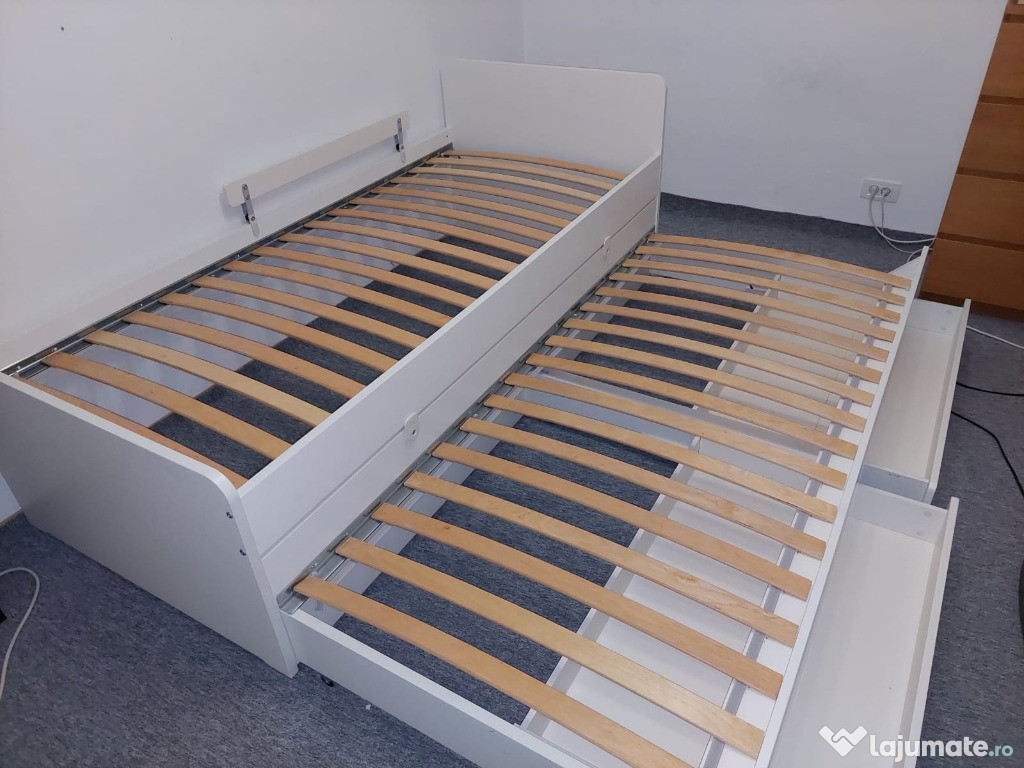 Cadru pat 90x200 cm (doua paturi+ doua sertare), din colecția Ikea Släkt, confortabil și durabil, potrivit pentru o cameră de dormit.Patul a fost folosit ocazional, saltele sunt impecabile. Au fost protejate de topper.