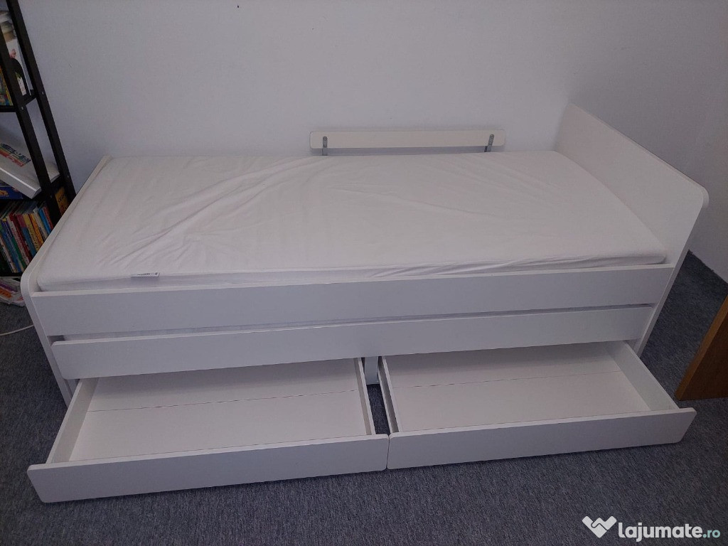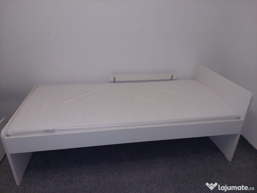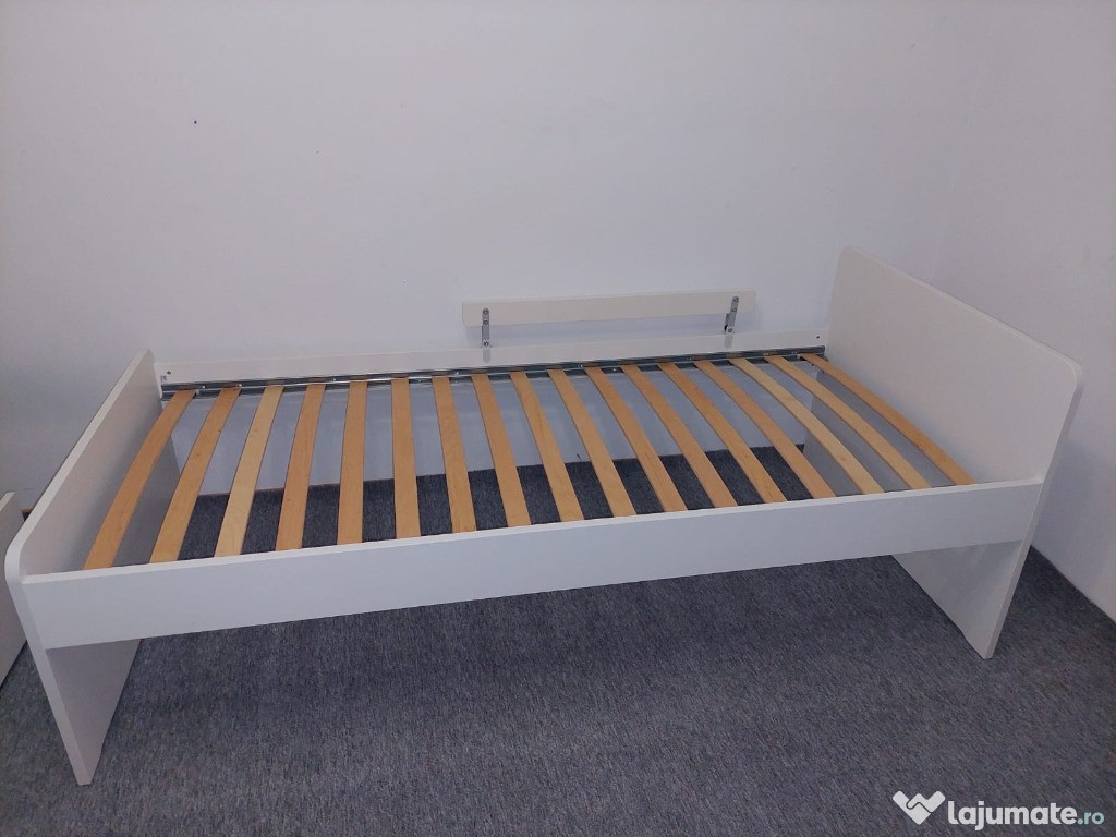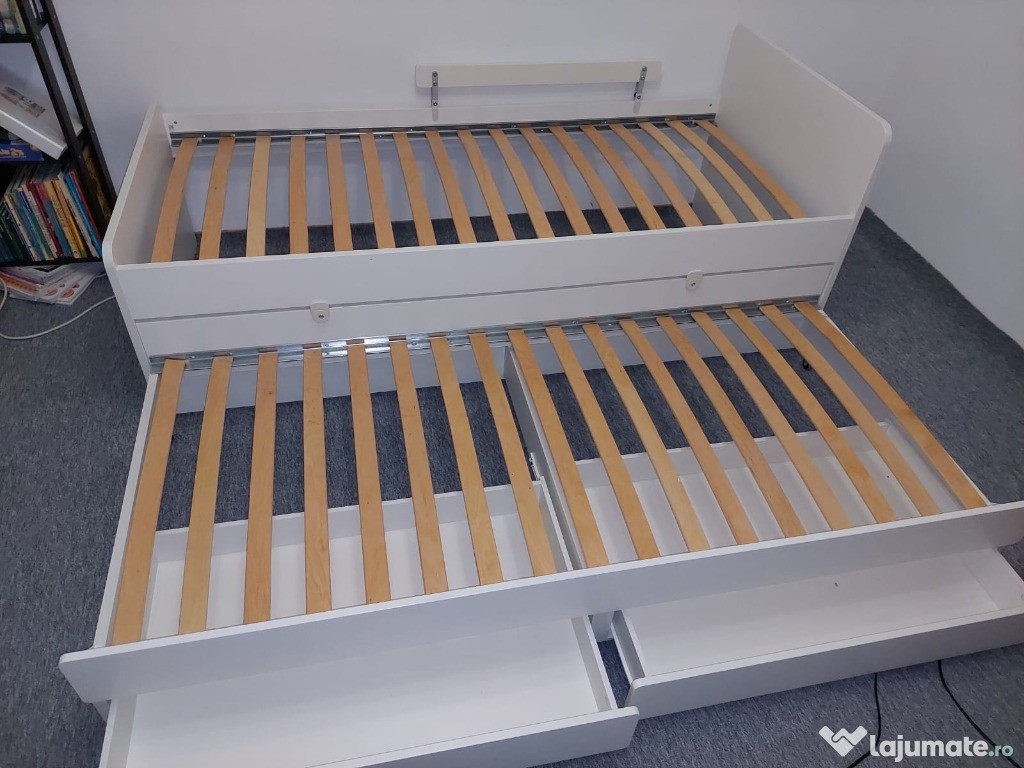 Cadru pat 90x200 cm (doua paturi+ doua sertare), din colecția Ikea Släkt, confortabil și durabil, potrivit pentru o cameră de dormit.Patul a fost folosit ocazional, saltele sunt impecabile. Au fost protejate de topper.