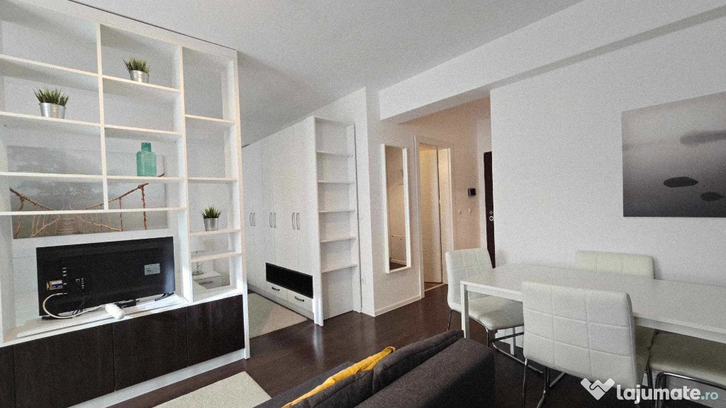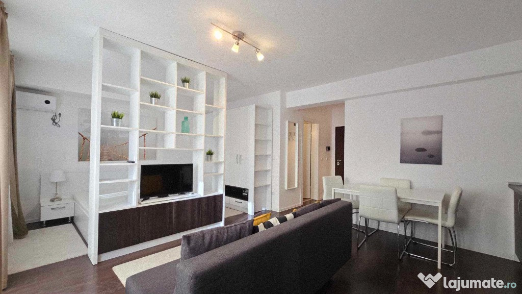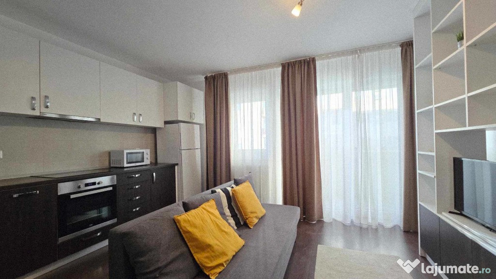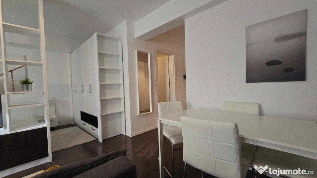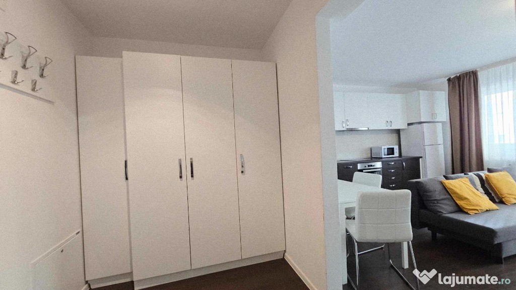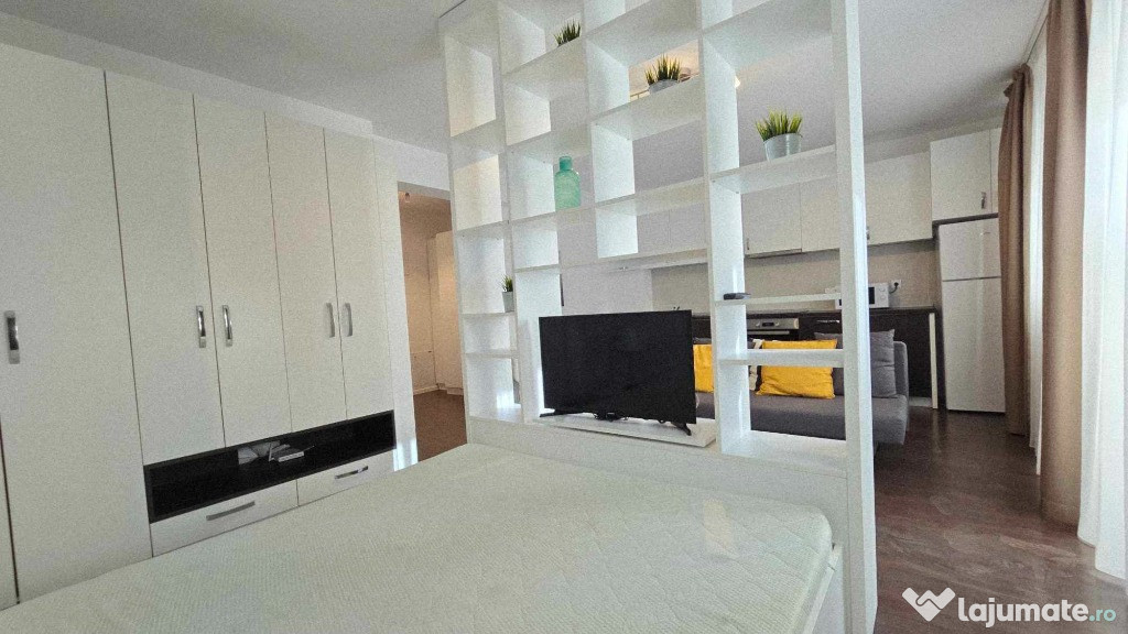 Compartimentarea ideal amenajată într-o formulă aparent living bucătărie în spațiu deschis și dormitor practică în amenajarea studioului eficientizată la maxim cu multiple spații de depozitare astfel confortul acestui studio devine apropiat unui apartament cu 2 camere.