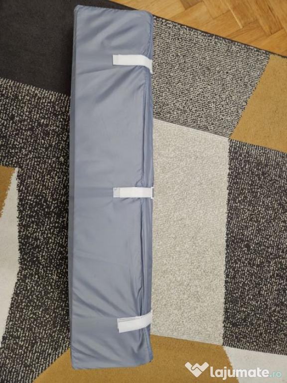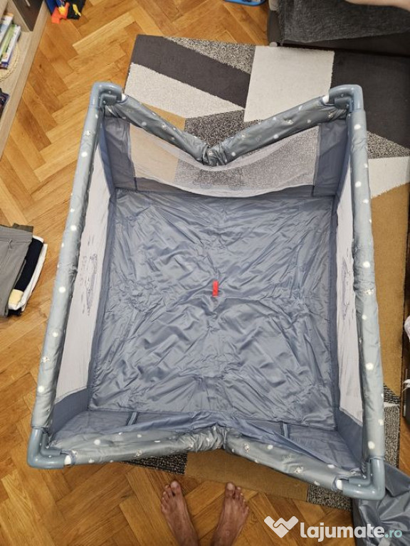 Prevazut cu salteluta de 2 cm grosime si imprimeuri vesele si animate, cu suport din material dur (placaj) pentru ca bebelusul sa poata dormi pe un plan drept.