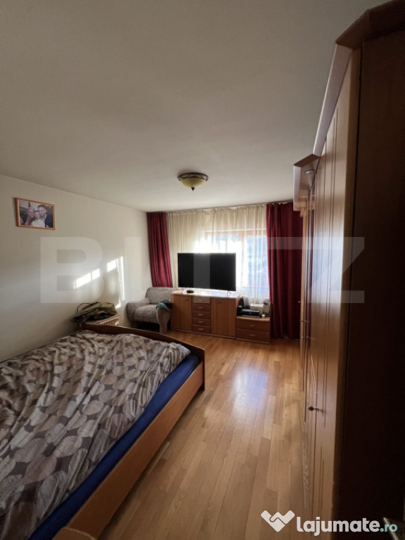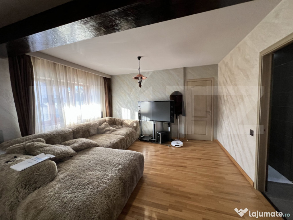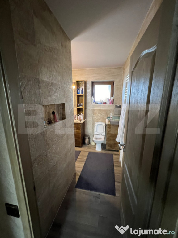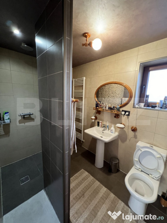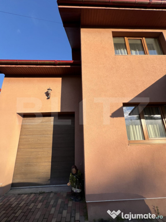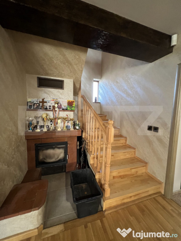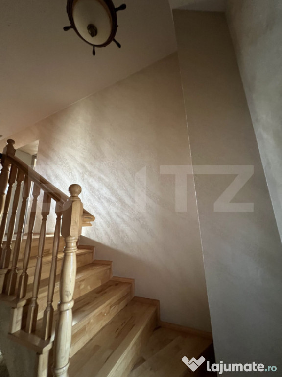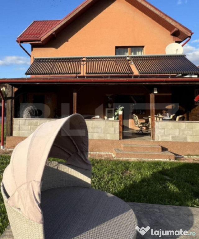 BLITZ vă propune spre vânzare o casă individuală cu piscină și priveliște panoramică spre pădure, situată într-o zonă de excepție a localității Chinteni. Vila este construită pe două niveluri, într-o zonă liniștită din Chinteni, oferind un cadru ideal pentru cei care își doresc un spațiu generos și o conexiune directă cu natura, fiind amplasată pe un teren vast de 750 mp. Suprafața utilă de 195 mp este optim compartimentată pentru a asigura confort și funcționalitate. La parter vila dispune de un living spațios, cu ferestre mari ce permit pătrunderea luminii naturale, este ideal pentru momente de relaxare și petrecerea timpului cu familia sau pentru seri de cinema la TV. Bucătăria open-space, dotată la standarde înalte este integrată cu zona de dinning, oferind un spațiu deschis și primitor pentru gătit și servit masa alături de familie sau celebrarea unor evenimente. Terasa acoperită de la parterul vilei oferă locul perfect pentru a savura cafeaua de dimineață sau admira asfințitul, beneficiind și de o saună uscată pentru relaxare. Proprietatea este amplasată într-o zonă bine conectată la 10 minute de Cluj-Napoca, pe o stradă privată, asigurând acces facil către facilități și infrastructură. Cele trei dormitoare de la etaj sunt confortabile și luminoase, beneficiind de o baie complet utilată, modernă și funcțională. Accesul la etaj se face prin intermediul unei scări elegante din lemn, ce adaugă un plus de rafinament interiorului, în ton cu parchetul din lemn masiv de stejar în stare excepțională.Curtea cu o suprafață generoasă, este perfectă pentru joaca copiilor în natură, amenajări peisagistice, grădinărit sau relaxarea în aer liber la piscina dotată cu sistem profesional de filtrare a apei și panouri solare pentru încălzirea apei. În curte este amenajat și un loc pentru grătare sau pentru focuri de tabără.