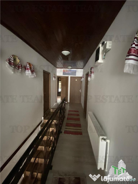 Bucatarie open- space de 35/40 mp, tip living,complet echipata, cu mese si scaune pentru 20/25 persoane, perfecta pentru grupuri, evenimente sau turisti. Vila e echipata cu centrala termica noua,boiler de rezerva de 1000 l, calorifere cu termostat.